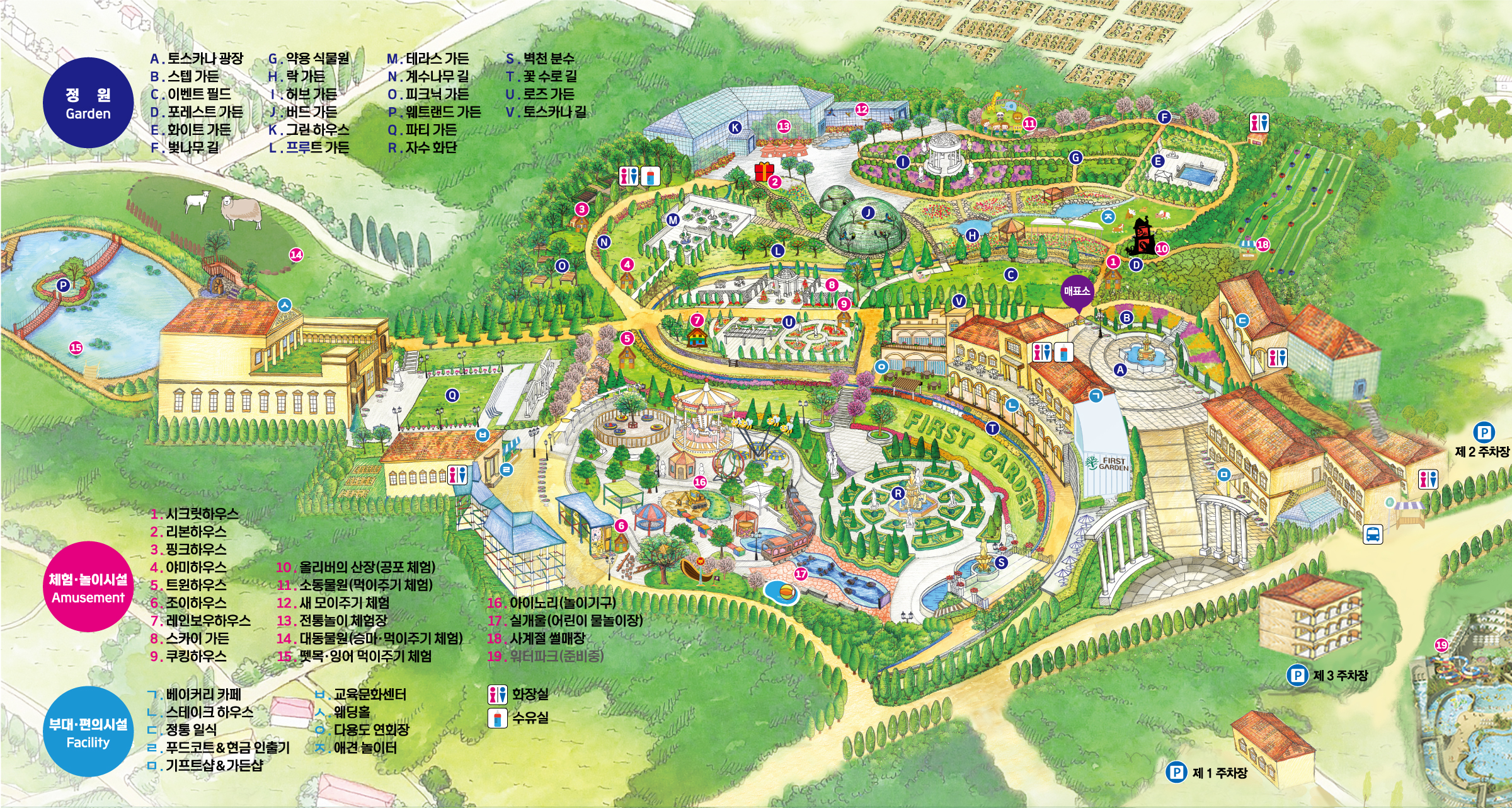 그외에도 레스토랑, 웨딩홀, 놀이시설, 체험학습, 기프트샾, 썰매장, 챌린지 코스등 다양한 편의, 놀이시설을 갖추고 있어 단순히 정원 관람 뿐만 아니라 종합테마파크로서의 모습을 가지고 있습니다.