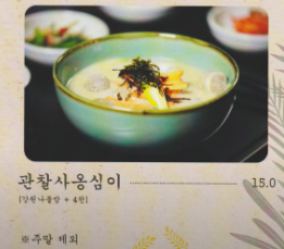 3. 감자 옹심이: 강원도 감자를 갈아 만든 반죽을 수제비처럼 뜯어서 들깨 베이스에 끓여낸 음식으로 명륜동식당, 단구동고기집, 원주가성비맛집의 대표 먹거리입니다.