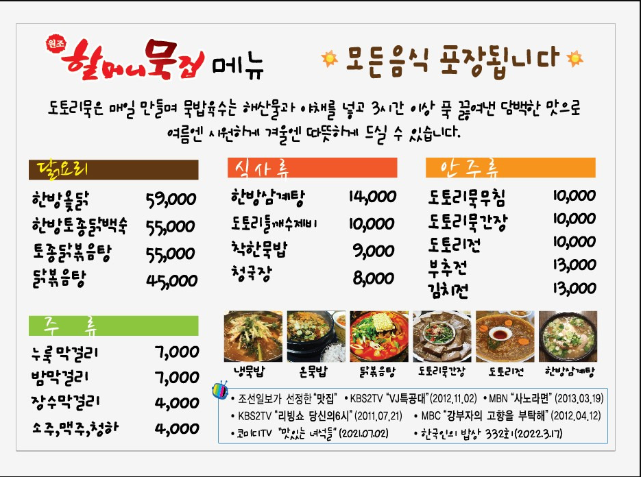 '할머니 묵집'은 '한국인의 밥상', '맛있는 녀석들', '하트시그널' 등 다양한 방송 프로그램에 소개되며 그 맛과 전통을 인정받았습니다. 특히, 직접 만든 도토리묵과 할머니의 손맛이 담긴 다양한 메뉴들이 방문객들의 입맛을 사로잡고 있습니다.