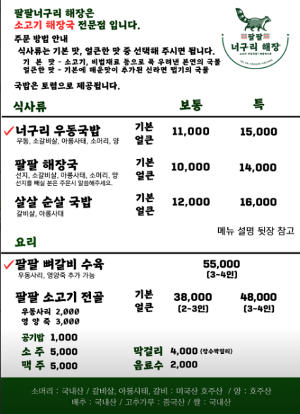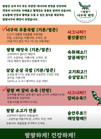 - 너구리 우동국밥[얼큰/기본] (11,000원): 얼큰한 국물에 우동 면발과 다양한 재료가 어우러진 시그니처 메뉴입니다.